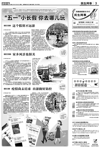 相当一部分网友表示,宅在家太久了,“五一”假期气温适宜,是出门放松的好时机。“孩子一直在家上网课,特别想亲近大自然,呼吸新鲜空气,不过按照教育部门发布的‘五一’假期原则上不跨域流动的通知,我们不会带孩子离开安阳,自驾到乡村体验下农家乐吧。”网友“周周”表示。网友“燕子”说,前些天,我市发布了“迎客入安”的旅游优惠政策,还开通了免费旅游公交线路,真是太给力了!一定不能错过这个好机会。网友“裴师傅”是一名驾驶员,他说:“我假期还要上班,不过会在工作之余带家人去散散心,家门口的风景也很美。”