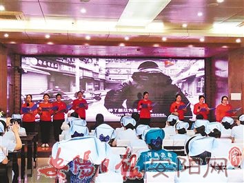 会上,该院发热门诊、发热病区等科室护理人员进行了洗手舞表演,驰援武汉和市第五人民医院的医护队员献上了诗朗诵《我们都是战士》。
