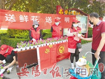 5月15日上午,市游园管理站携手北关区文明办在北关区雷锋广场开展了一年一度的“送鲜花送文明”活动。活动中,志愿者们先后将800盆各色矮牵牛花送给了市民,并为大家提供关于花卉种植的相关资料,帮市民解决养花种植中遇到的问题。图为活动现场。