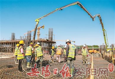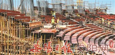 当天下午3时许,记者在项目施工现场看到,密集的脚手架、交叉编织的钢筋网、高耸的塔吊、忙碌的建筑工人,各个主体场馆施工有序推进。
