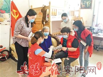 昨天,文峰区东大街街道高阁寺社区联合市第一实验小学教师开展“党员志愿服务进社区 助力全国文明城市创建”主题党日活动。图为志愿者向辖区居民宣传我市开展的道德模范和“身边好人”评选活动。(张 娟 摄)