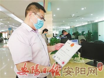 经过不懈努力,今年2月初,“洹上三仓”农产品商标通过国家知识产权局商标注册公告,5月20日,三仓村驻村第一书记赵相峥领到了“洹上三仓”商标注册证,标志着三仓苹果有了正式“身份证”。图为市政务服务和大数据管理局政务大厅商标咨询窗口,赵相峥查看领到的“洹上三仓”商标注册证。