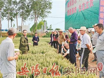 为大力推进我市高标准农田建设,5月20日,安阳市农科院、河南省“四优四化”科技支撑行动计划优质小麦专项专家韩勇(左二),深入汤阴县菜园镇杨辛庄“安麦1350”示范田田间,就小麦生产后期干热风的危害及防范措施和小麦适时收获等内容对种植户进行技术指导,现场解答群众在生产中遇到的问题,为确保粮食安全和农户收益做好最后一公里的冲刺。