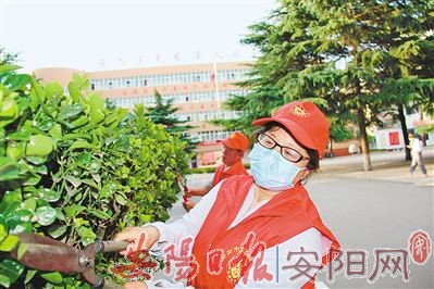 近日,在市文博源小学和人民大道小学的校园里,茂盛的雪松滋生了虫害,受害雪松的枝条及针叶上、冠下地面和地被物上均落有蚜虫分泌的黑色胶状蜜露。得知这一情况后,5月24日,市游园管理站的青年志愿者先后到市文博源小学和人民大道小学,用打药等方式处理雪松虫害,同时对校园里的绿植进行了修剪整形,使校园的环境更加优美整洁。图为志愿者在市文博源小学修剪绿植。(李娜 摄)