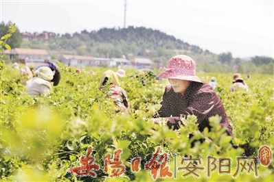 初夏的阳光火辣辣地照射着大地。5月26日,在林州市桂林镇张街村的田地里,金黄色的花朵吐出细细的花蕊,万氏家庭农场的金银花到了采摘的季节。