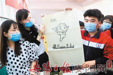 活动现场,池建周为学生讲解了木版年画的“前世今生”、制作技艺,并向学生赠送呆萌可爱的安阳航空运动文化旅游节吉祥物“航航”年画作品,请同学们体验年画的制作过程。图为活动现场。(本报记者 任贵伟 摄)