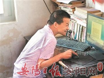 5月21日,王金光正晃晃悠悠地站立在自己的电脑桌面前,弯着腰用右手食指艰难地推动、点击鼠标,缓缓敲击键盘……