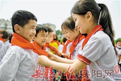 6月1日,在安徽铜陵市义安区实验小学入队仪式上,高年级学生(右)为新入队队员系红领巾。