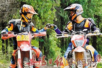 5月24日,越野摩托车爱好者渠慎民(左)、钱程在骑行前相互鼓励。