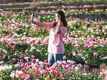 6月1日,游客在大板镇三家子村中草药种植基地的芍药花海中自拍。