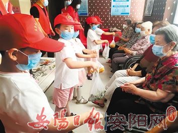 为大力弘扬中国传统文化,昨天,豆腐营街道盘庚西社区组织辖区幼儿园开展了“春蕾孝亲”端午节为老人送粽子活动。图为活动当天,孩子们为老人送上志愿者包的粽子、菜角。(张颖敏 摄)