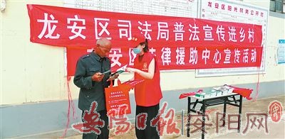 6月18日上午,龙安区司法局组织普法志愿者带着丰富多样的普法宣传品在马投涧镇宋家堂村开展“普法宣传进乡村”活动。活动现场悬挂了宣传条幅、设置了法律咨询台,志愿者热情地向过往村民发放了“法律援助知识指南”和“龙安区司法局法律援助温情卡”等普法宣传资料。