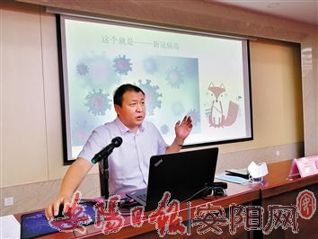 市人民医院呼吸内科副主任医师于磊从新型冠状病毒的病学特点、临床表现和消毒防护入手,重点讲授了学校区域防护知识。“把口罩的橡皮筋绕在耳朵上,使口罩紧贴面部,还要完全覆盖口鼻和下巴……”于磊还结合自身专业,生动地向同学们展示了正确佩戴口罩、七步洗手法、如何使用消毒湿巾等生活中的防疫知识要领,激发了学生遵守学校疫情防控要求的自觉性,并针对当前如何科学理性应对新冠肺炎、疫情时期如何进行心理干预及调适等问题进行讲解。最后对何时应该就医、就医注意事项以及个人和居家防护等内容进行了说明。