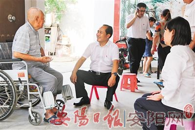 图为聂喜旺(中)正在与老党员王振山亲切交谈。(杨柳杏 摄)