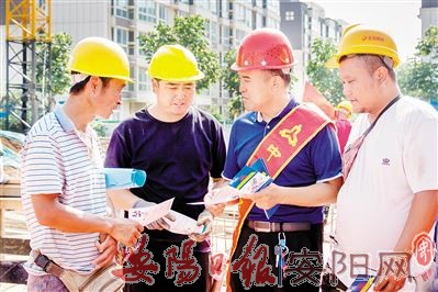 图为人行安阳县支行业务人员(右二)在安阳县崔家桥镇的建筑工地向企业员工宣传金融知识。(王建安 摄)