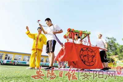 8月4日,民间艺人在河北省遵化市平安城镇大麻各庄村校园操场指导孩子们学习民俗节目。