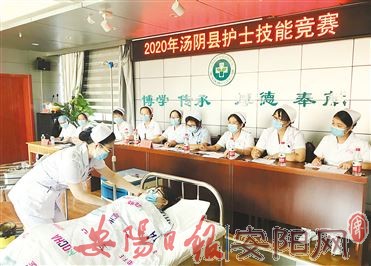 7月30日,2020年汤阴县护士技能竞赛决赛在县中西医结合医院举办。本次技能竞赛由汤阴县总工会联合县人社局、县卫健委共同举办。参赛选手从医学护理知识、密闭式静脉输液等方面进行技能比武。此次比赛有效激发了医护人员钻研业务、苦练技能的工作热情,进一步巩固和提高了医护人员的规范操作及护理水平,为提升全县护理质量奠定了坚实基础。图为竞赛现场。(王计亮 摄)