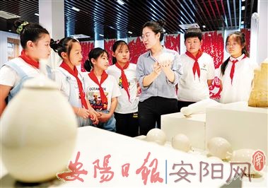 8月6日,在河北省内丘县邢瓷文化体验馆,工作人员为小学生们讲解邢白瓷知识。