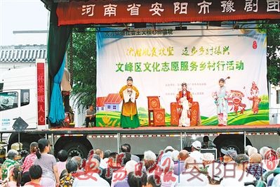 8月15日下午,由文峰区文化广电体育旅游局、文峰区文化馆主办,文峰区宝莲寺镇人民政府、商颂办事处协办的“决胜脱贫攻坚、迈步乡村振兴”文峰区文化志愿服务乡村行系列文化活动在宝莲寺镇袁薛庄文化广场拉开帷幕。本次演出采取政府购买服务形式,特邀请安阳崔派艺术研究院为9个村送去34场大戏。戏剧小品《脱贫名单》、经典剧目《包青天》《三娘教子》等精彩节目轮番登场。文峰区文广体旅局、文峰区文化馆常态化开展文化下乡、送戏下乡等文化惠民活动,把文化送到了百姓门口,切实提升了广大群众对文化生活的获得感、幸福感和满意度。(本报记者 高学艳 摄)