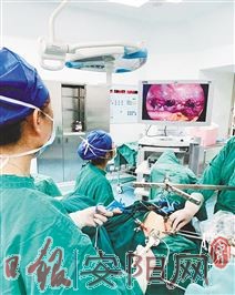 图二 该院妇科团队开展悬吊式腹腔镜(无气腹)子宫切除手术。