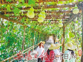 河岸南侧是下里街村打造的田园综合体,百蔬园里的葫芦、丝瓜、黄瓜、苦瓜、瓠子挂满枝头,百果园里的桃树、苹果树、梨树、樱桃树应有尽有,池塘上空不时有白鹭飞过。本地游客胡国军带孩子来游玩,在百蔬园久久停留。胡国军说:“孩子在这里大饱眼福,见到了平常所吃的蔬菜都是怎样长的,很兴奋,还说这些葫芦让他想到了葫芦娃。”长廊顶部藤蔓缠绕,结的葫芦大小不一。一阵风吹过,葫芦在藤蔓上左右摇摆,好像真的会随时落地蹦出来一个葫芦娃。
