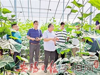 为推进内黄县设施黄瓜提质增效,9月15日至16日,河南省大宗蔬菜产业技术体系创新团队专家,深入内黄县梁庄镇产业扶贫园区,查看黄瓜大棚秋延迟新品种试验示范项目进展情况。 (任领兵 摄)