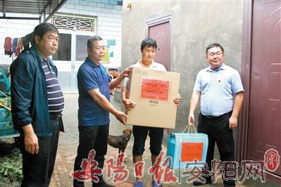 滑县烟草专卖局机关党支部与半坡店镇闫河屯村党支部结对共建一个多月来,围绕“凝心聚合力、共建促发展、脱贫奔小康”总目标,每周开展不同的主题党日活动,使该村党建活动越来越有特色。图为9月21日,滑县烟草专卖局党员志愿者为贫困户闫子电(右二)等3个贫困家庭送去电风扇、夏凉被、书包等“微心愿”物品。