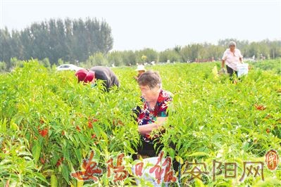 目前,王庄镇郎柳集村67公顷香辣尖椒喜获丰收,许多农民加入鲜椒的采摘、分拣、晾晒、装箱等工作中,尖椒基地呈现一派丰收景象。农民采摘鲜椒每公斤0.4元的手工费,尖椒种植让农民足不出村就能挣到零花钱。