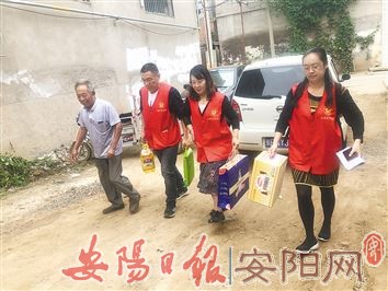 9月27日上午,文峰区商务局志愿者及帮扶责任人到宝莲寺镇东风村慰问4户建档立卡贫困户,为贫困户送去大米、食用油、牛奶、面包等慰问品,送去了党和政府的问候与祝福。 (韩 芳 摄)