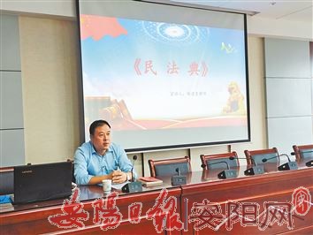 此次讲座邀请河南兴亚律师事务所专职执业律师、中华全国律师协会会员杨建勇律师主讲。杨建勇对《中华人民共和国民法典》颁布实施的重大意义、基本理念和框架体系等方面做了系统阐述,并对其中一些与民众生活息息相关的条款进行了解读。(祝家佳 摄)