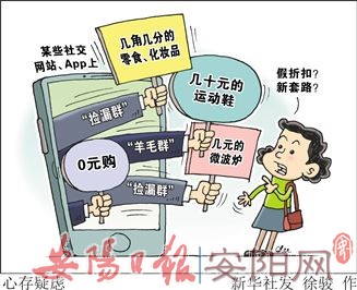 近日,不少消费者反映在各大社交网站、App上出现了一大批以超低折扣商品为卖点的“捡漏群”“羊毛群”等,群主、主播们无不宣称在群里能买到巨大优惠的名牌产品,比如,几十元的运动鞋,几元的微波炉,几角几分的零食、化妆品,甚至还有0元购物机会。