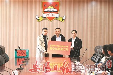 10月19日下午,市政协常委、民进安阳市委会秘书长原征一行来到安阳学院,为该校捐赠2万只爱心口罩,以进一步充实该校防疫物资储备,保障师生身体健康和生命安全,为常态化疫情防控工作打下坚固基础。图为安阳学院党委副书记、校长贺海鹏(左三)代表该校接受捐赠。(本报记者 韩镔肇 摄)