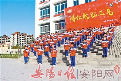 10月27日,内黄县向阳路小学举行“唱红歌 弘正气”歌咏比赛。全校1349名学生以班为单位,身着红色校服组成“中国”“心”等图案,以不同形式高声同唱《国家》,通过歌唱洗涤心灵,弘扬正能量,激发师生们内心的爱国情怀,让孩子们从小树立爱国主义思想,立志努力学习,长大成才后报效祖国。(刘院军/文 赵乙璇/图)