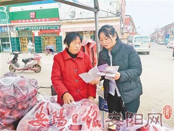 图为发行日当天,滑县中银富登村镇银行工作人员在滑县城关农贸市场开展2020版5元人民币宣传工作。