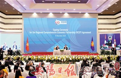 在当天举行的在线签署仪式上,东盟10国和澳大利亚、中国、日本、韩国、新西兰5国经贸部长依次签署该协定,15个成员国领导人见证了这一全球重大自贸协定的签署。