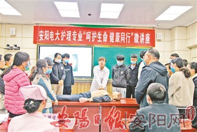 11月18日下午,安阳职业技术学院电大工作部(安阳广播电视大学)护理专业本科学生在学院8号楼举办“呵护生命 健康同行”微讲座,为信息工程学院全日制学生讲授心肺复苏急救知识。本次活动旨在提高学生紧急自救和他救能力,并通过电大开放教育在职学生和全日制学生联合教学,探索职业教育教学改革新模式,提升人才培养质量。