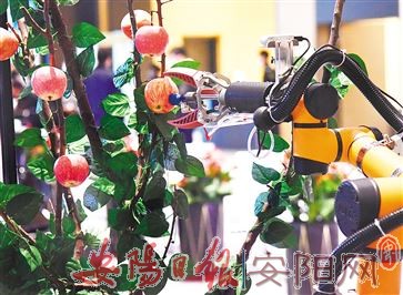 11月23日,一台苹果采摘机器人在成果展示现场演示。