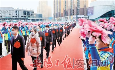 市职工文体中心外,手捧鲜花的少先队员高喊“向英雄致敬”,列队欢迎英雄的到来。我市抗击新冠肺炎疫情先进集体、先进个人、优秀共产党员、先进基层党组织代表踏上红地毯,拾级而上,在热烈的气氛中有序进入会场。