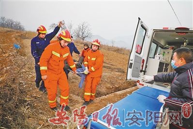 1月4日16时许, 林州市任村镇西坡村一男子到山坡上摘柿子,由于柿子树枝杈断裂,该男子一不小心从树上摔下来,躺在地上无法动弹。附近村民向消防人员求助,消防人员迅速赶到、成功施救。