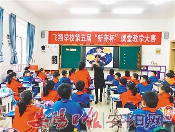 市飞翔学校连续多年开展“青蓝杯”“新芽杯”课堂教学大赛活动。各学科老师积极参与,精心备课,课堂教学精彩纷呈。语文课堂以读促讲,“读”占鳌头,以多元教学形式点燃了学生的学习热情。数学课堂循序渐进、环环相扣,特别的教学设计促使学生展开一场场头脑风暴。寓教于乐,寓学于乐,幽默风趣的英语课堂让学生在游戏中快乐成长。图为1月2日,在英语课堂教学大赛上,老师与学生积极互动。