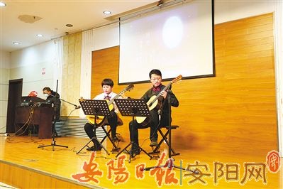 1月1日下午,室外寒气袭人,室内暖意融融,一场美妙的音乐会在市“两馆”一楼多功能厅举办,这场音乐会就是2021不期而遇——韩洪涛古典吉他新年赏析音乐会。本次音乐会由市文化广电体育旅游局主办,市图书馆、安阳泛美教育承办。韩洪涛老师的一曲吉他独奏《不期而遇》拉开了演出序幕。只见他左手在弦上上下游走,右手很有节奏地拨弄着琴弦,婉转悠扬的曲调、娴熟的手法技巧,赢得了台下观众的阵阵掌声。两个多小时的吉他新年赏析音乐会,共为台下观众带来了十几个节目,其中有吉他合奏、吉他独奏,作品有当代原创作品,有中国风格的经典曲目,也有古典主义的吉他二重奏……美妙的音乐声回荡在演出现场,令人陶醉。