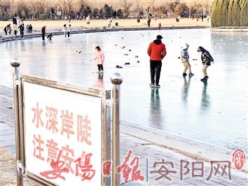 1月9日下午,记者在易园看到,不少市民在结冰的太极湖面上滑冰玩耍。而湖面有的地方并没有冻结实,还可以看到水,附近也设立着“水深岸陡,注意安全”“珍爱生命,安全第一”的牌子。在没有安全保障的户外冰面上运动,存在安全隐患。在此提醒广大市民,不要在自然结冰的湖面上滑冰玩耍,以免发生危险。(本报记者 王小彤 摄)