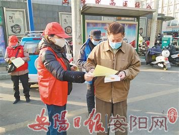 1月14日下午,市道路绿化管理站志愿者在市中医院附近宣传《安阳市文明行为促进条例》。当天,志愿者身穿红马甲,向群众发放《安阳市文明行为促进条例》宣传手册和文明行为倡议书,耐心劝阻随地吐痰、随手扔烟头、不遵守交通规则等不文明行为,引导群众从小事做起、从细微处着手,养文明习惯、行文明礼仪、树文明形象。(王建华 摄)