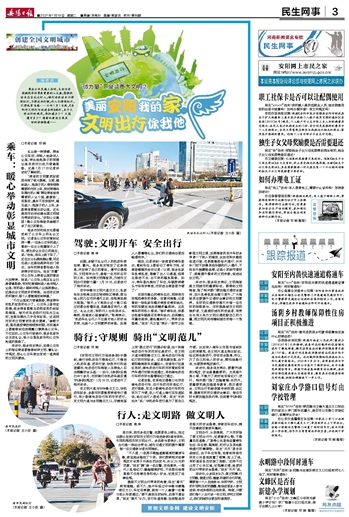 乘坐公共交通工具时,主动为老弱病残孕幼等有需要的人让座;驾驶机动车应当礼让行人;骑行非机动车不得闯红灯,不得逆向行驶;行人不得闯红灯,不得乱穿马路……今年1月1日起,《安阳市文明行为促进条例》施行,关于文明出行的规定,你知道多少?又能遵守多少?请看记者连日来采访的详细报道——