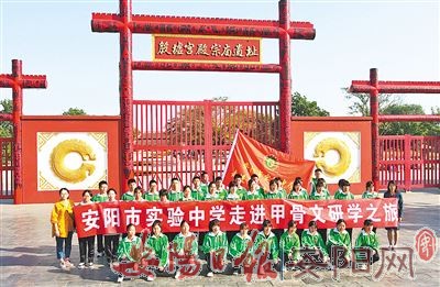 市实验中学作为省级文明校园,全国书法实验学校,省、市书法教育先进集体,为继续弘扬我国优秀传统文化,贯彻落实习近平总书记致甲骨文发现120周年重要讲话精神,使学生在校学习的甲骨文文字得到更多的历史考证,多次组织学生进行甲骨文研学游。去年,在该校领导支持下,科研处组织学生到中国文字博物馆开展“参观文字博物馆、感受文字魅力”研学活动,带领学生到殷墟博物馆参观学习,感知殷商文化的发源,找寻甲骨文文字的魅力。