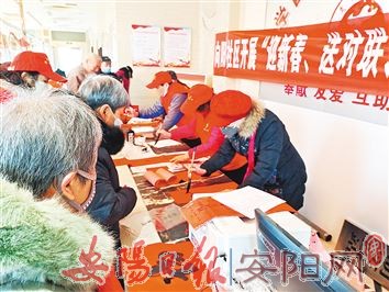 2月2日上午,安阳市银龄志愿服务队来到北关区豆腐营街道办事处向阳社区开展义写春联活动。志愿者书写好的一张张充满节日喜庆气氛的福字和一副副春联送给社区的老年人,受到了大家的好评。