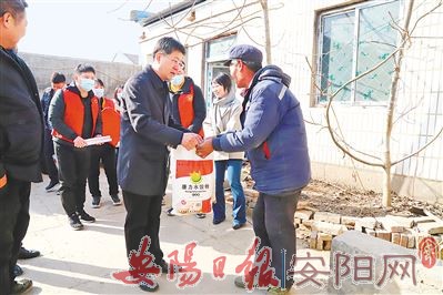 春节前夕,市便民服务中心党委委员、副主任吕向阳(前排左一)一行带领中心机关支部党员志愿者到内黄县二安镇前花固村开展“感党恩、送温暖”主题党日活动,给村民送去米面油、春联、消毒液、口罩等物品。吕向阳及中心机关支部委员代表与村干部围绕乡村振兴和春节疫情防控等工作进行了交流。吕向阳一行还来到贫困户郭春礼等人家中进行慰问,深入了解他们的生活、精神状况,让他们感受到党组织的关怀。(朱盛立 摄)