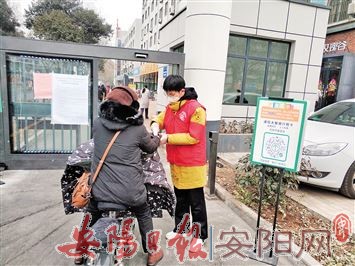 “我是河南师范大学大二的学生,从小就生活在曙光小区。作为社区志愿者,我的工作是在疫情防控点对出入人员进行体温测量和记录,对外地返安人员进行详细的信息记录和行李消杀,并及时向社区报备。”今年20岁的赵旭光对记者说。寒假返安的赵旭光见到小区内的公示栏张贴了许多有关疫情防控的通知,听到小区内的大喇叭、小喇叭关于疫情防控的广播不断,还没顾得上走亲戚、同学聚会,便主动来到社区办公室,询问是否需要志愿者,主动穿上了“红马甲”,成为一名社区志愿者。