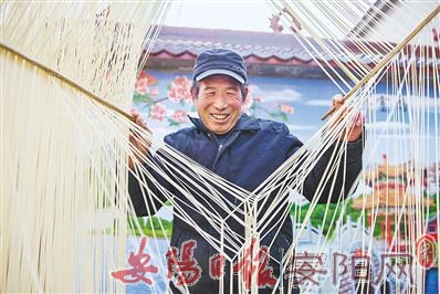 白道口镇东小寨村的手工挂面历史悠久,迄今已近千年,手工精致,条细如丝,根根空心,堪称一绝,具有回锅如新、久煮不烂、食之柔滑等特点,成为该村的一项支柱产业。图为3月2日,该村村民正在拉面。