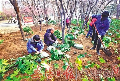 眼下正是春季绿化养护的黄金期,易园组织全体干部职工加班加点进行绿化改造和补绿栽植,包括易园西大门景观大树更换和园内增绿补绿等。日前,首批1.6万余株银杏、八角金盘、红豆杉等乔灌木,苔草、鸢尾等地被草坪,荷花、再力花、水生鸢尾等水生植物正在园内扎根。图为3月9日,易园工作人员在栽种绿植。 (夏飞 摄)